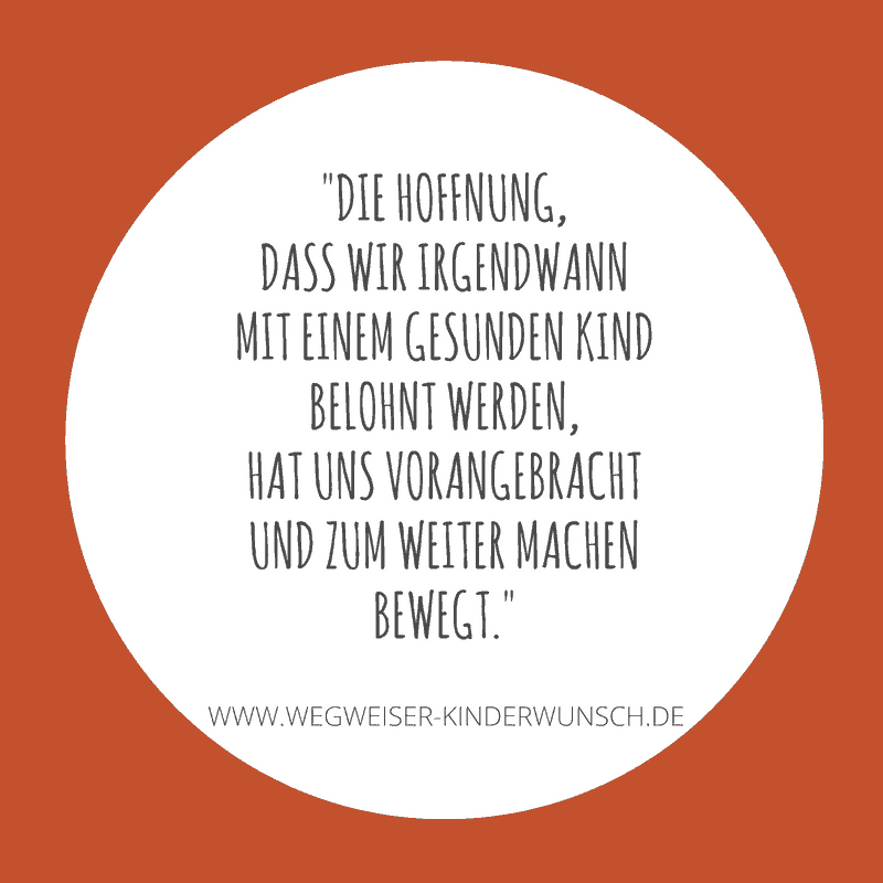 Nach jedem gescheiterten Versuch und eigentlich auch bei jedem neuen Zyklus hatte ich einen Tiefpunkt. Aber der schlimmste Tiefpunkt damals war wirklich, die Fehlgeburt nach dem dritten Versuch. Die Hoffnung, dass wir irgendwann mit einem gesunden Kind belohnt werden, hat uns vorangebracht und zum weiter machen bewegt.