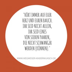 Lasst euch bitte von niemandem stressen, was den Kiwu angeht. Geht offen mit dem Thema um, das beugt vielen Verletzungen vor. Und hört immer auf euer Herz und euren Bauch. Ihr seid nicht allein, ihr seid eines von sieben Paaren, die nicht schwanger werden (können).