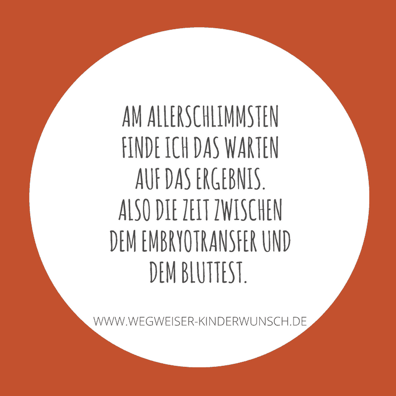 Die größte Herausforderung bei dem ganzen Thema ist und bleibt für mich das Warten. Am allerschlimmsten finde ich das Warten auf das Ergebnis, also die Zeit zwischen dem Embryotransfer und dem Bluttest. Man weiß, dass man einen Embryo in sich trägt, aber nicht, ob er sich gut entwickelt oder überhaupt noch da ist. Man kann den ganzen Tag an nichts anderes denken und muss natürlich auch darauf achten sich gesund zu ernähren, wenig Kaffee zu trinken etc. Also man kann sich ganz schlecht ablenken und die Zeit zieht sich wie Kaugummi.